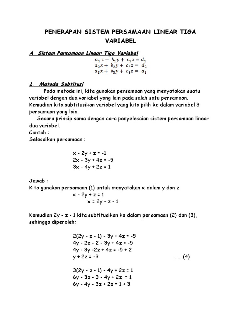 Metode subtitusi yaitu menyatakan suatu variabel dalam variabel lainnya yang selanjutnya digunakan untuk mengganti variabel yg sama dalam Contoh soal cerita dan pembahasan persamaan linear tiga variabel Sistem persamaan linear dua variabel (peubah) atau disingkat SPLDV adalah suatu persamaan matematika yang terdiri atas dua persamaan linear Demikianlah artikel dari dunia.pendidikan.co.id mengenai Persamaan Linear : Satu, Dua, Tiga Variabel, Pengertian, Contoh Soal, Rumus, Metode.